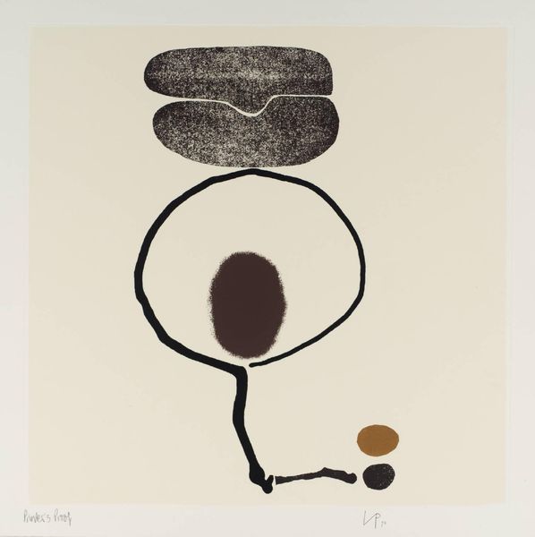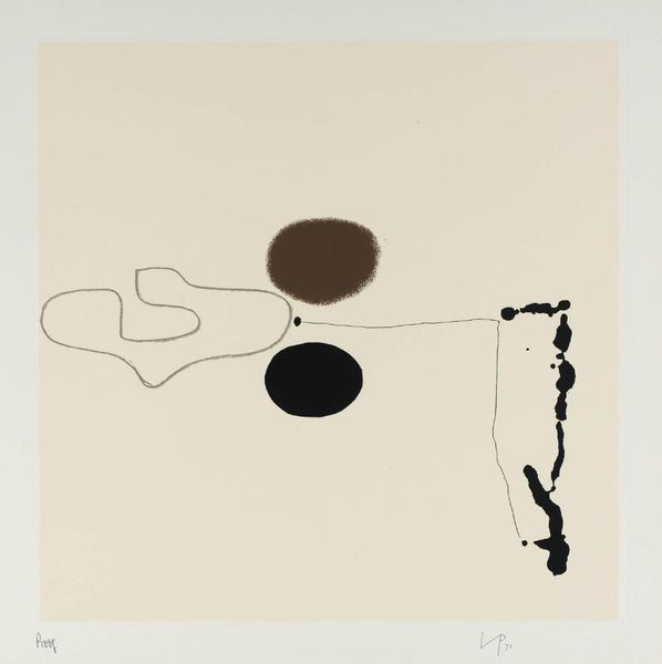 Curator: This is Victor Pasmore’s "Linear Development 6," part of the Tate collection. What’s your initial impression? Editor: I find it remarkably spare. The limited palette and seemingly simple forms give it a very graphic, almost industrial feel. Curator: The composition certainly emphasizes form and line. Note the textured mass on the left, contrasted with the delicate network of lines and dots. Editor: It’s interesting how Pasmore uses these shapes to suggest weight and balance, but I'm also curious about the printmaking process. What kind of labor went into creating these textures? Curator: The interplay of shapes is key here, establishing a visual dialogue that leads the eye across the surface. Editor: I agree, but thinking about production adds a layer of complexity to how we see this "dialogue" of shapes. Curator: A compelling point. It seems we’ve both found avenues for appreciating Pasmore's construction. Editor: Yes, the material process and the final form offer rich ground for understanding this piece.