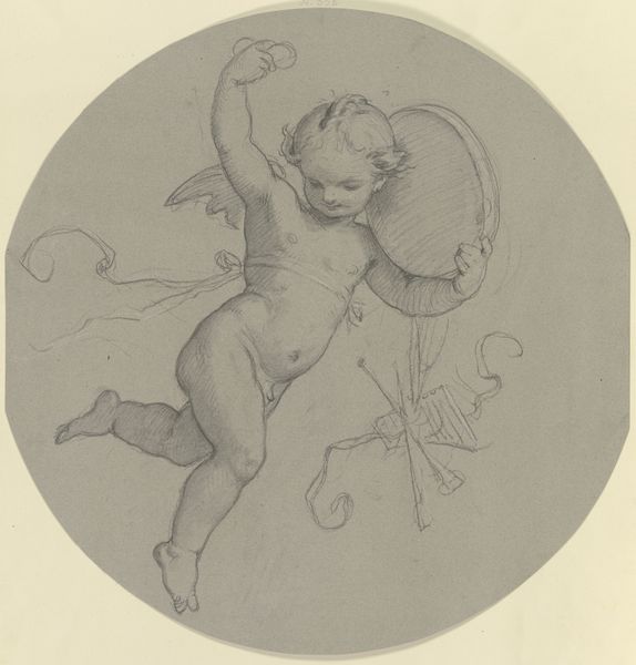 Moritz von Schwind’s drawing, "Schwebender Putto mit Traube und Trinkschale" at the Städel Museum, presents us with a floating putto rendered in delicate pencil strokes. The circular composition encloses the cherubic figure, creating a sense of contained movement and lightness. The formal arrangement invites a semiotic reading. The putto, holding grapes and a chalice, becomes a signifier of abundance and celebration. The grapes, positioned above, draw the eye upward, while the chalice, held firmly in the putto's left hand, suggests a counter-narrative of grounded stability. The artist’s delicate linework, reminiscent of classical friezes, destabilizes traditional associations by placing them in a more playful, accessible context. Through a combination of classical motifs and an informal presentation, Schwind subtly invites us to reconsider established meanings, making this work a site of ongoing interpretative possibilities.