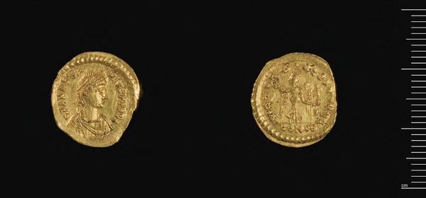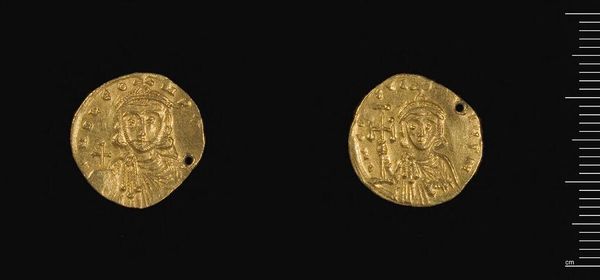 Curator: I'm struck by the weight of history in such a small object. This is a coin of Huvishka, part of the Harvard Art Museums collection. Editor: Gold always has an immediate impact. And the raised figures, despite their wear, seem full of symbolic presence. Curator: These coins served as propaganda, circulating Huvishka’s image and legitimizing his rule. Coinage reflects the socio-political landscape. Editor: The standing figure on the reverse, holding what looks like a scepter, carries an interesting echo of classical iconography. A sign of cultural exchange, perhaps? Curator: Absolutely. The Kushan Empire was a crossroads. These coins demonstrate the confluence of Greek, Roman, and Central Asian imagery, all serving Huvishka’s imperial ambitions. Editor: It's fascinating to think of the cultural information embedded within such a small, everyday object—and how it persists across millennia. Curator: Indeed, a tiny window into a vast empire.