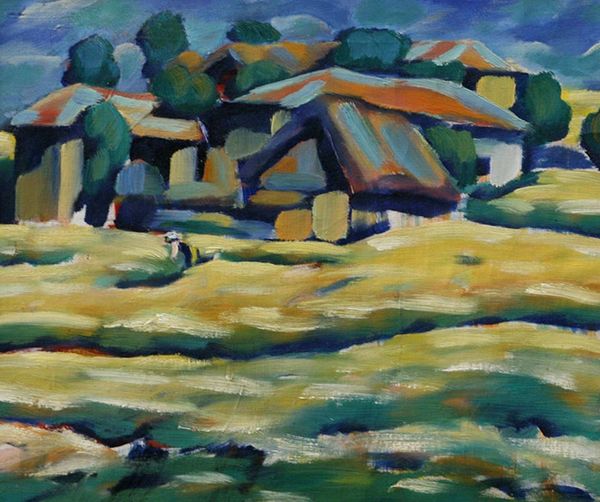 Editor: This is Raquel Forner's "Casas," painted in 1926 using oil paint. I'm immediately struck by the angular forms and how she renders a cityscape with these blocks of colour. It's almost disorienting. How do you interpret this work? Curator: A fitting disorientation, indeed. The structure of this composition relies on the interplay of geometric forms and a vibrant, almost Fauvist palette. Note how Forner eschews traditional perspective, flattening the picture plane and creating a tension between representation and abstraction. Do you observe the application of paint itself? Editor: Yes, the brushstrokes are quite visible, and the colours seem almost arbitrarily assigned to the shapes, creating this tension you're describing. It makes the buildings feel less like actual structures and more like arrangements of color. Curator: Precisely. It is through these formal elements—color, shape, and texture—that Forner constructs her visual language. It invites us to consider the painting not just as a representation of a cityscape, but as an independent object, exploring the inherent qualities of painting itself. How does the simplification of form and emphasis on color impact your understanding? Editor: It makes me think about how modern artists were breaking down traditional artistic conventions. They explored what paint could do rather than focusing solely on depicting reality. The way you described it shifts my focus from subject to composition. Curator: An important distinction. The beauty of Formalism lies in its ability to illuminate the aesthetic strategies employed by the artist and underscore how these choices shape our experience of the artwork. Editor: I’m understanding more about how analysing form creates another depth of the artistic representation. Curator: Indeed. And that focus on elements elevates the artistic discourse beyond representation and dives deep into the nature of seeing.