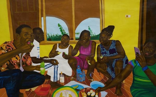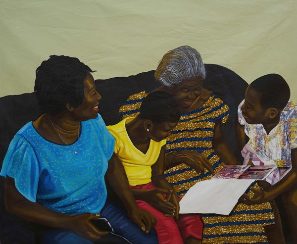 ‘For me, archiving as an art form has the potential to open up discussions on lost and forgotten histories.’ ️ We all know that art can offer us a lens into the past – but whose past? We’re used to seeing portraits of the wealthy and famous, from monarchs to mythological characters. However, the Ghanian figurative painter Cornelius Annor (b. 1990) uses his art to shine a light on the often overlooked activities of everyday life. Born into a family of artists, Annor has exhibited his work across the world. His father, also named Cornelius, was a celebrated sculptor in Ghana – yet his work was never displayed elsewhere during his lifetime. What might this say about the changes that have occurred in the international art world over the last few decades? This work, painted by Annor in 2022, is titled ‘We Have Taken Our Sit’. It depicts four Ghanian women sitting on a porch, with a young boy who is dressed in vibrant colours. The tone is casual and intimate; it almost reminds me of a photograph that you might see in a family photo album. All of the women seem comfortable and unposed. The second woman has even kicked off her flip-flop! The women are dressed in exuberant prints which match their beaming smiles. This creates a joyful energy. Annor used acrylic paint as well as cutouts of fabric for this painting. The work is a diptych, meaning it consists of two separate pieces of canvas which form a pair. If you zoom in, you can just about see the dividing line in the centre of the frame. ‘We Have Taken Our Sit’ belongs to Annor’s series titled ‘Memories We Share’. This collection aims to capture both memorable and ordinary moments from day-to-day life. The painting represents a conventional family gathering, bringing together multiple generations. It’s a great example of how contemporary artists are using their practice to highlight less traditional subjects. 🖼️