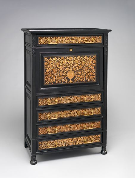 Herman Doomer created this ebony cabinet with inlaid ornamentation sometime in the 17th century. This was the Dutch Golden Age, a period when the Netherlands became a major economic power, fueled by its vast colonial empire. The cabinet itself reflects this wealth. It is made of luxurious materials and decorated with intricate details. Open, you can see an interior which imitates a fashionable interior, complete with a chequered floor, pilasters, and inlaid figures. The cabinet would have been commissioned by a wealthy merchant or aristocrat as a show of status. It’s not just a functional piece of furniture; it’s a symbol of their place in the world. We can learn about Dutch society in the 17th century through objects like these. By studying the materials used, the craftsmanship involved, and the symbolism of the decoration, we can gain insights into the values, beliefs, and aspirations of the people who created and used it.