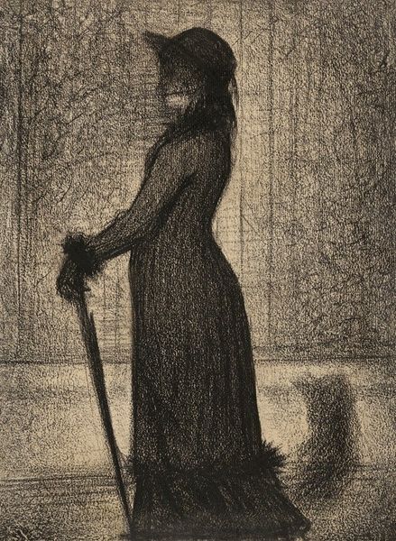 Curator: This haunting image, rendered in etching, is entitled "Sur Le Seuil," or "On the Threshold," created in 1902 by Théophile Alexandre Steinlen. Editor: It evokes such a feeling of apprehensive expectation, doesn't it? The heavy darkness, contrasted by the brightness from the open doorway. Curator: Indeed. Steinlen was deeply engaged with the social realities of his time. The doorway as a symbol suggests a pivotal moment or impending change. Note how this print underscores the plight of marginalized figures in Belle Époque Paris. Editor: That door really seizes the attention. Is it an invitation, a release, or simply a divide? The woman's dark clothing, a visual echo of the background, contributes to this tension. Curator: Precisely. In Symbolist art of this era, such dramatic light often serves to underscore states of profound psychological unease and transformation, and Steinlen effectively employed symbolism throughout his oeuvre to draw attention to injustice. Editor: Do you think her posture communicates something more? Almost a resistance or reticence? I am sensing the emotional weight the open door creates. It could represent choice or necessity. Curator: Given his political leanings, and his ties to socialist and anarchist circles in Montmartre, it's plausible Steinlen employed the open door to signify the urgent need for societal change, but through the solitary figure, suggests individuals alone are vulnerable. The lack of any companion in the space leaves an isolating impact. Editor: The composition as a whole is deeply thought-provoking, with the door acting like a spotlight, almost stage-like, forcing you to consider her narrative. You have such strong symbolism, all rooted in a single point. Curator: Ultimately, Steinlen urges us to confront uncomfortable realities. The strength of his art lies in its persistent social critique, delivered through striking compositions such as this one. Editor: An artist committed to conveying both the burdens and the prospects facing turn-of-the-century society. Curator: Precisely. An excellent summary. Thank you.