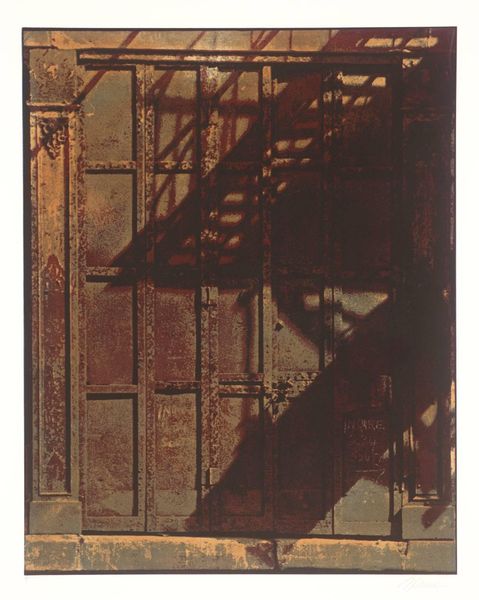 Curator: Gerd Winner's "Catfish Row, New York 5" offers such a striking image of urban decay. Editor: The rust tones and heavy shadows give it a claustrophobic feeling, almost a warning. Curator: The use of serigraphy allows for the stark details to highlight themes of urban decay, echoing social and economic neglect. Editor: That graffitied symbol and the chain, what do they signify? Is it about exclusion, or is it a territorial marker? The layers of meaning are dense. Curator: The repetitive, almost architectural elements surrounding that chained door speak to systems of power, who is allowed access and who is not, and the historical implications of those divisions within urban landscapes. Editor: There's a real psychological weight here, isn’t there? The way the light falls almost like a spotlight… Curator: Yes, Winner invites us to look critically at the structures defining urban life, particularly for marginalized communities. Editor: It’s a haunting image, making you question what has happened here. Curator: Indeed, it's a potent commentary on urban alienation. Editor: The symbolism definitely lingers.