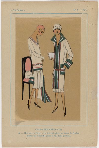 This print called 'Très Parisien' was made in 1925, by G-P. Joumard using some kind of printmaking technique. It looks like it was made with stencils or woodcuts, giving it a graphic, almost blocky feel. I love how the artist used simple shapes and flat colors to create depth and texture, especially in the clothing. Notice the black coat on the left – the way the lines create the shape of the coat and its folds is so simple, yet so effective. It reminds me of the reductive quality of Matisse's paper cutouts, but with a bit more of an edge. And the color palette – the muted greens and browns, combined with the stark blacks and whites, evoke a sense of understated elegance, but it also seems quite modern to me. It makes me think of Sonia Delaunay, who was exploring similar ideas in her textiles and paintings around the same time. It's like they're all part of this big conversation about how to represent the world in new and exciting ways.