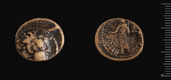 Curator: Here we have a coin of Demetrios II, who ruled the Seleucid Empire in the 2nd century BCE. Editor: It's so small, almost lost to time. The portrait on one side has a melancholic feel, despite the wear. Curator: Coins like these served a critical purpose. They weren't just currency; they were propaganda. The image of the ruler, or a deity associated with him, was instantly recognizable. Editor: And potent, right? The visual language of power. Even this tiny symbol could evoke loyalty and authority. What's the symbol on the other side? Curator: It's likely an anchor, a symbol often associated with the Seleucid dynasty, perhaps referencing their maritime power. Editor: It's amazing how a single object, even in its diminished state, can encapsulate so much history and cultural meaning. Curator: Absolutely. It's a tangible link to a world we can only glimpse through fragments like these.