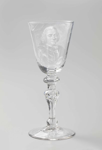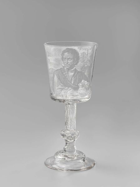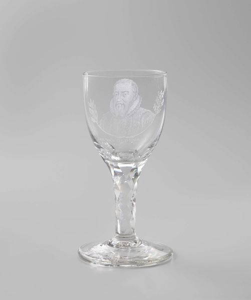 This is an etched glass featuring a portrait of William V, crafted by an anonymous artist. The glass itself is a study in contrasts, its clear, smooth surfaces juxtaposed with the meticulously etched portrait. Notice how the artist uses the transparency of the glass to create depth. The portrait is rendered in a delicate, almost ghostly manner, playing with light and shadow to define the subject's features. The etching forms a semiotic system in which each line and curve functions as a signifier. These signs come together to produce meaning through an austere classical style. The glass’s form, with its elegant stem and flared bowl, speaks to a tradition of refined craftsmanship. It’s not just a drinking vessel but an object imbued with cultural and political significance. It is an interpretation of a prominent figure and how this intersects with craftsmanship and societal values. The glass transforms from a mere object into a canvas of meaning, constantly open to interpretation.
