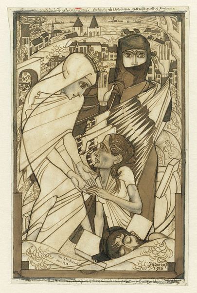 This is Jan Toorop's poster, made to advertise the Nationale Tentoonstelling van Vrouwenarbeid, or National Exhibition of Women's Labor, held in The Hague, Netherlands. The monochromatic rendering immediately directs our attention to the composition. A woman stands tall in the foreground, dominating the frame, with other women behind her. The central figure wields a hammer on an anvil that reads 'Arbeid voor de vrouw,' or 'Labor for women', suggesting strength, and industriousness, which echoes ideas of the 'New Woman' and female empowerment. Above, a sphinx reclines, which can be interpreted as a symbol of mystery and power, watching over the scene. The figures are rendered with soft, curvilinear lines reminiscent of Art Nouveau, which gives the image a sense of ethereal beauty. Toorop’s poster goes beyond mere advertising; it is a cultural artifact which encapsulates the changing roles of women at the turn of the 20th century, challenging viewers to rethink societal expectations through its bold imagery and symbolic forms.