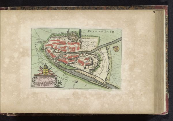 Editor: This is "Bombardement van Dieppe, 1694," dating from around 1700 to 1735. It's an anonymous work, using ink, watercolor, and engraving, displayed as a drawing within what looks like a sketchbook. The image, depicting the aerial view of a city under attack from the sea, looks incredibly detailed for the time. What historical symbols or cultural contexts do you find most prominent in this work? Curator: The visual language here speaks volumes about power and vulnerability. The overwhelming number of ships aimed at Dieppe aren't merely vessels of war; they symbolize relentless aggression, an almost biblical deluge threatening to erase the city. Consider the cultural memory embedded in cityscapes themselves - fortifications meant to protect, now rendered fragile by advances in weaponry. What stories does this contrast tell you? Editor: It shows the futility of traditional defenses, perhaps? That even the most fortified cities were becoming vulnerable. It also reads like propaganda of some kind, emphasizing the attackers’ strength. Curator: Exactly! Note how the artist meticulously renders each ship, each cannon blast – details that serve not just as record, but as a carefully constructed narrative. Do you notice anything else about the visual balance, or imbalance, of power being depicted? How might the townspeople have felt looking at this depiction? Editor: The ships certainly dominate the scene. Knowing this represents a real event adds a layer of gravity. Seeing it now, removed from the immediate fear, offers a chance to reflect on the enduring impact of conflict on communities. It's not just about destruction, but resilience too. Curator: Precisely. By decoding the symbols, we can gain insights into the cultural trauma, psychological impact, and the narratives crafted around such historical events. Visuals such as this preserve collective memories long after the event fades from living memory.