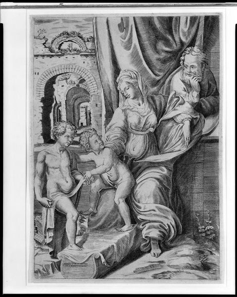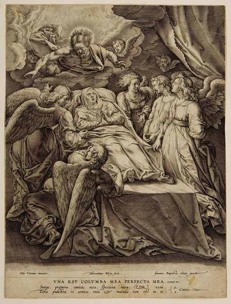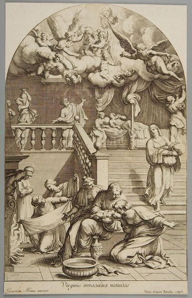 Curator: I find the dramatic chiaroscuro immediately captivating. It's an older work titled "Design for the Fugger Chapel in Augsburg: Samson Fighting the Philistines" and is credited to Albrecht Dürer. Editor: It hits you like a punch in the gut, doesn’t it? All that chaotic energy bursting from a monochrome sketch. Like a heavy metal album cover from the 1500s. Curator: The composition is particularly striking. Dürer uses a dense, almost claustrophobic arrangement of figures to heighten the sense of struggle. Notice the dynamism achieved through the diagonal lines, leading the eye from the lower left to the upper right. Editor: Totally. Samson, right in the middle, feels like the eye of the storm. Everybody’s tumbling around him. And is that inscription supposed to be funny? It is sort of jarring against the hyper-violence on display. Curator: It's crucial to observe Dürer's mastery of line. The intricate detail, especially in rendering the textures of skin, fabric, and weaponry, demonstrates a meticulous observation of the material world, elevated through the symbolic biblical narrative. Editor: The way he throws that spotlight—if you can call it that—onto Samson makes the whole scene pop. All those little details in the armour, the crumpled bodies... It makes you think about power and its consequences. Very heavy stuff, even today. Curator: It evokes complex responses in viewers even now, wouldn’t you say? The formal precision amplifies the emotional turbulence inherent in the subject. Dürer presents us not only with the heroics of Samson, but also a meditation on the complexities of human strength. Editor: Definitely a piece that sticks with you. Not just a picture; more like an experience. It's that clash of beauty and brutality...pretty haunting. Curator: Indeed, it's a complex piece. And from an art historical standpoint, observing this work’s form and texture lets us better appreciate its role in marking a transition from late medieval to Renaissance ideals, but, of course, as the piece has proved, one's lived and embodied encounter matters. Editor: Yep, something in it just wrangles with the guts.