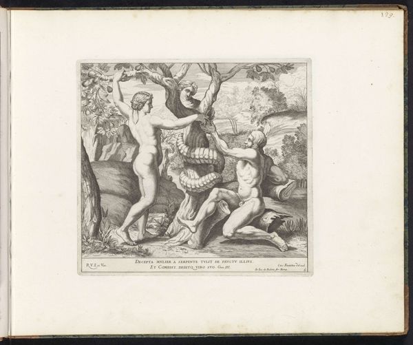 Curator: Benoît Audran the Younger’s print, “Love Disarmed,” presents Venus, her body softly modeled, struggling with a mischievous Cupid trying to snatch her bow. Editor: There's a tenderness here, isn’t there? Even with Cupid's rebellious grab, the mood feels less combative and more... playful. Curator: Exactly. Look at the tonal gradations achieved through the delicate use of hatching and cross-hatching. It creates depth while softening the potentially dramatic scene. Editor: And the landscape peeking behind—it’s not just background; it almost echoes the figures, a sort of wildness tamed by composition. Does it speak to the struggle between reason and raw emotion, perhaps? Curator: Possibly. Given that Audran was working within a tradition of reproductive engraving, maybe we should simply marvel at the technical skill—the way he translates paint into line. Editor: I do appreciate the artistry. Still, I love how it hints at the messy, joyful tug-of-war that love can be. Curator: A charming interpretation.