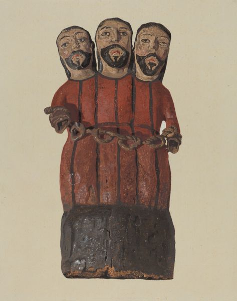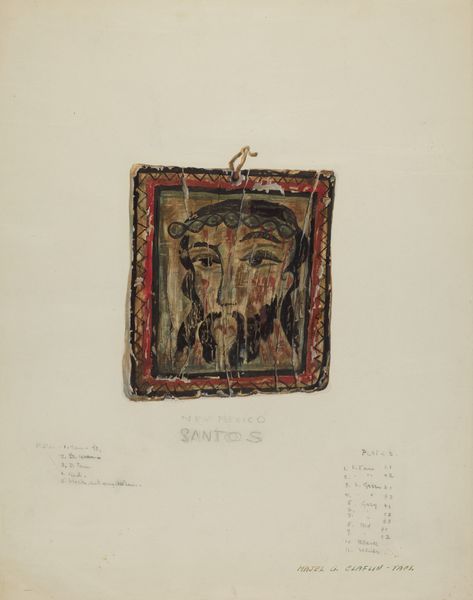 Curator: Here we have Majel G. Claflin's "Head of San Jose," created around 1939, a drawing that initially strikes me with its stark simplicity. What is your immediate impression? Editor: It feels… incomplete, almost like a forgotten memory struggling to resurface. The neutral background really amplifies the solitude radiating from that head. Curator: Indeed. The artist employs a muted palette, primarily earth tones, to render the sculptural head, emphasizing its geometric forms and highlighting the material's inherent textures, wouldn't you say? Editor: Absolutely! Those rigid, almost severe angles lend the piece a strangely stoic feel. I wonder if that geometric quality hints at a deeper yearning for order, or perhaps a silent reverence for structure, something the artist seeks out through her process. Curator: The portrait focuses intensely on the planes of the face, reducing it to essential forms. Observe how each element seems carefully constructed to create an impression of solidity and enduring strength. Editor: You know, looking at it again, I see how Claflin captured a stillness but also decay within this single portrait, there's such beauty in acknowledging that delicate balance. It's almost a memento mori, disguised as… a head. Curator: Note also the unusual head covering, it introduces a slightly surreal element. This combination of geometric precision and dreamlike incongruity offers an interesting tension in the work. It invites us to explore the conceptual framework underlying portraiture itself. Editor: And I think it pushes the conversation. If that "head covering" is actually a representation of authority, or higher learning, this creates so many more layers. The muted palette keeps it grounded but there's no way you walk away without questions. Curator: Precisely. Claflin skillfully encourages such dialogue through the chosen form, through its deliberate formal construction that invites prolonged inspection and contemplation. Editor: Ultimately it comes back to the beauty that these small and intentional formal choices can create within the piece. It is a humble moment made profound through art. Curator: Yes. A potent distillation of form and spirit, demanding that we attend closely not just to what is presented, but how it compels us to see, to ask questions about art, but to question life itself.