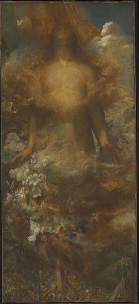 Curator: This is George Frederic Watts's monumental "Eve Repentant," held here at the Tate. I find the scale of this painting quite impactful—almost overwhelming. Editor: Yes, its immensity is striking. The canvas itself suggests a certain grandeur of production, doesn't it? Consider the labor required to stretch and prepare such a surface. Curator: Absolutely. The materiality contributes to the narrative; Eve, seemingly ashamed, hides her face, a gesture loaded with socio-religious implications about female guilt. Watts is engaging with a very specific cultural understanding of sin. Editor: And the earth tones—browns and muted golds—speak to a return to the earth, to a literal grounding after the Fall. I wonder about Watts's studio practice—did he mix his own pigments? Curator: Perhaps! It all adds to our reading of Eve within broader narratives of shame and redemption. It certainly gives us a lot to reflect on. Editor: Indeed—from pigments to patriarchal structures, it's all interwoven here.