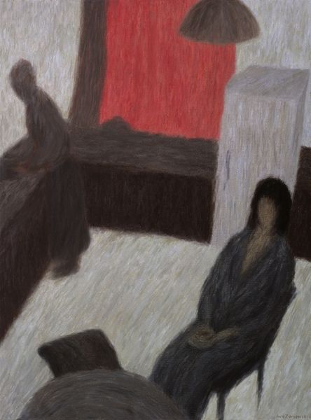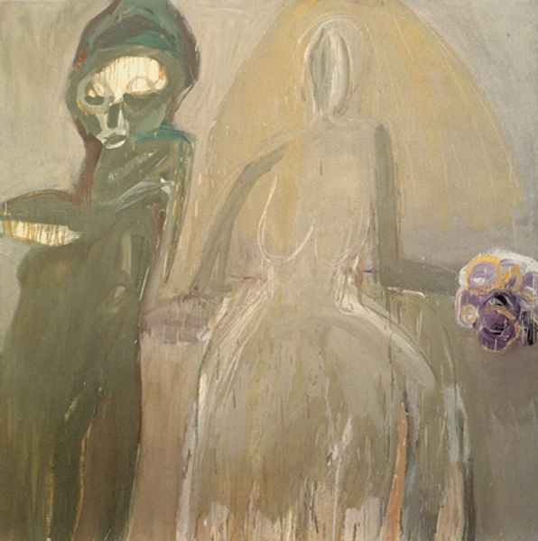 Editor: This is "A Man Who Suddenly Fell Over" by Michael Andrews. It's quite large, painted with oil on canvas. The scene feels so surreal, almost dreamlike. What story do you think Andrews is trying to tell? Curator: Ah, a very human story, wouldn't you say? I feel that this work captures a moment of unexpected vulnerability and the reactions it provokes. The woman’s expression contrasts sharply with the man's…a comedy of errors, perhaps? It's funny and poignant all at once. Editor: So, you’re saying the painting is as much about the fall as it is about the reactions? Curator: Exactly! It's like Andrews invites us to consider our own responses to the stumbles of others, both literal and metaphorical. Editor: I hadn’t thought of it that way. There’s so much more to this painting than meets the eye.