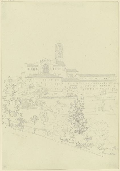 Curator: This pencil drawing, "S. Pancrazio, von der Villa Pamphili aus gesehen," by Friedrich Maximilian Hessemer, captures a Roman vista in February of 1828. The Städel Museum holds this delicate rendering. My immediate impression is of faded grandeur. Editor: Yes, it speaks to the picturesque movement and perhaps even anxieties surrounding the shifting socio-political power structures in early 19th century Rome. I'm curious to know, though: why this vantage point? Curator: Note how Hessemer precisely depicts architectural details. The planes of the buildings are clearly defined. His handling of light and shadow, particularly on the cylindrical apse, draws the eye and structures the whole composition. The linear rendering provides objective observation above subjective interpretation. Editor: But even objective observation is subjective. The choice of the Villa Pamphili as a viewing point speaks volumes. The Villa itself was appropriated during the period of the Roman Republic. Depicting St. Pancrazio from the stolen grounds emphasizes a complex history of ownership, power, and perhaps even resistance embedded in the seemingly serene Roman landscape. Curator: You offer a critical framework, absolutely. Yet, let's acknowledge how Hessemer is emphasizing Neoclassical ideals—order, symmetry—qualities inherent within the carefully balanced rendering, rather than imposing modern anxieties upon it. The composition, for instance, embodies balance and controlled artistic license. Editor: Of course, I appreciate Hessemer's technique. The delicate pencil strokes render architectural details with a quiet beauty, yet to ignore that art is made within sociopolitical landscapes silences broader narratives of oppression and perseverance. To examine this image without that understanding is to reduce its relevance in the now. Curator: Perhaps our readings aren't so divergent as they are complementary. Through the structure we've explored in this subtle landscape we also appreciate broader societal dynamics during its time. Editor: Indeed. The formal elements do lead us toward essential inquiries of historical narratives imbedded within its careful line work.