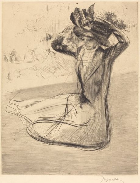 Editor: Here we have Edvard Munch's "Harpy," a print housed at the Harvard Art Museums. The stark lines and ghostly figures definitely give off an unsettling vibe. What do you see in this piece? Curator: This work points to Munch's experimentation with printmaking as a means of mass production. The process allowed him to disseminate his anxieties about the relationship between the sexes, and the print medium makes those anxieties accessible. How might its circulation affect its interpretation? Editor: That's a good point. Knowing it was widely available definitely shifts my perspective of it. Thanks for sharing your insights! Curator: Absolutely. Thinking about art in terms of its material existence opens up a whole new way of understanding it.