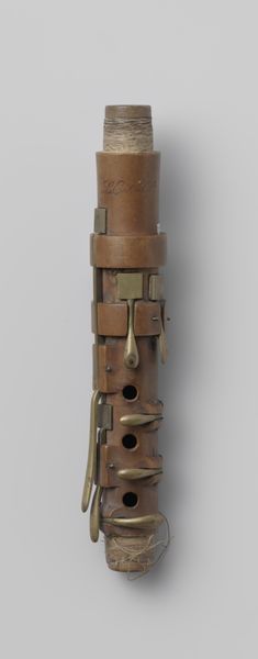 Curator: Here we have an oboe, crafted by E. Dupéyrat sometime between 1850 and 1900. Notice the intricate details; the combination of wood and brass elements creates a fascinating contrast. Editor: It’s quite striking. Immediately, I'm thinking about the role that music played during periods of immense social upheaval. Was this oboe intended for the parlor or for a concert hall filled with both wealth and political intrigue? Curator: Precisely, though looking purely at its form, we can appreciate how Dupéyrat masterfully merged the darker, heavier wood with the lighter, more reflective brass keys. The instrument presents an exquisite balance of visual weight. Editor: I’m drawn to the choice of materials. During the rise of industrialization, did the relative scarcity of finely crafted instruments reinforce class divisions and further marginalize musicians from already-disadvantaged backgrounds? Curator: From a structuralist perspective, consider how the cylindrical shape dictates its acoustic function. Each precisely placed key modifies the column of air, generating varied notes, and inviting analysis based on measurable outputs and sonic possibilities. Editor: It makes me wonder, though, how might this instrument, meant to produce harmony, also reflect the discord of its time? It is not merely a vessel of notes but a product of history shaped by, say, colonial desires, perhaps finding an echo even in the materials themselves? Curator: It offers an interesting counterpoint, considering that this oboe invites an analysis beyond socio-historical context to examine its aesthetic harmony in pure form. It strikes me as a testament to beautiful design. Editor: And so its survival provides us an opening for thinking more deeply about how an aesthetic and cultural artifact might outlive the circumstances of its creation, even if only as an eerie or discordant reminder.