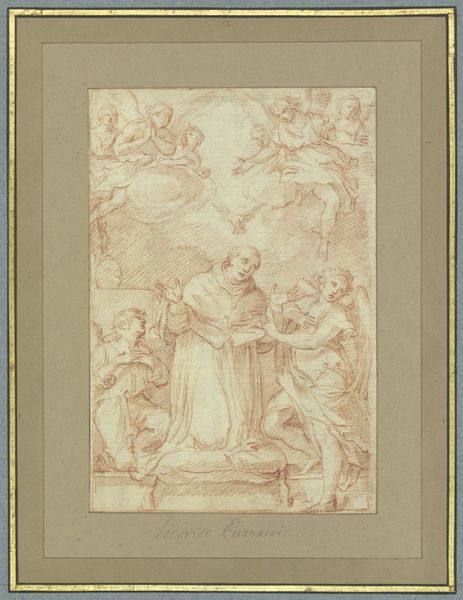 We might call this drawing a “noble wreck.” Drawn with lively assurance, it is also now sadly damaged. The scene is the Annunciation, a story from the New Testament book of Luke in which the angel Gabriel announces to the Virgin Mary that with the coming of the Holy Spirit she will conceive and give birth to the child of God, Jesus, who will rule the descendants of Jacob forever. This drawing was recently attributed to the Verona artist Paolo Farinati by Dott. Stefano L'Occaso, Director of the Palazzo Ducale (Mantua), who compares it to the artist's altarpiece of the same subject in SS Nazaro e Celso, Verona, which is signed and dated 1557. He has beautifully captured the drama of the miraculous event. Gabriel seems to glide down from heaven as his hair and clothing flutter in gusts of wind. He bends slightly to help alleviate Mary’s apparent fear, and he points upward to indicate the source of his astounding news.