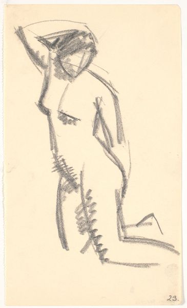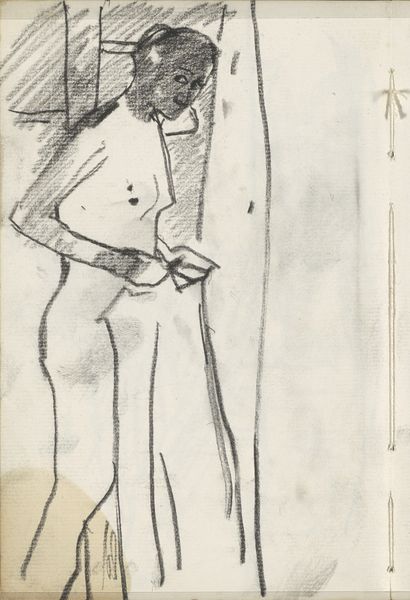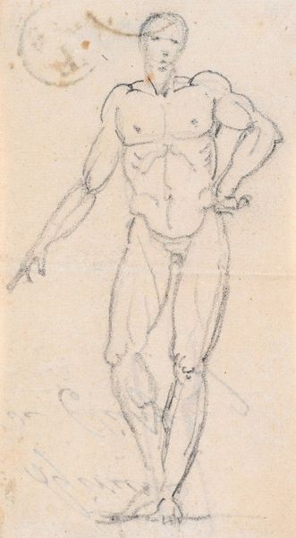 Charles Rochussen made this pencil drawing of a standing man with a lute. Rochussen was working in the Netherlands during a period of significant social change and artistic development; he was known for his illustrations of everyday life, often with a humorous or satirical edge. The man in this drawing is seen from behind, wearing what appears to be a theatrical costume, complete with a feathered hat, the lute hanging from his left hand. The figure's casual pose, with one hand on his hip, suggests a moment of rest or contemplation. Consider how the figure represents a moment of performance, of assumed identity. Rochussen’s work captures a sense of the performative nature of identity, which reflects the growing diversity and self-awareness within Dutch society. This drawing might seem like a simple sketch, but it invites us to think about how we construct our identities, and how artists like Rochussen observed and portrayed these shifts in their rapidly changing world.