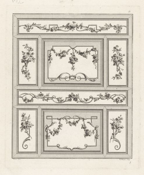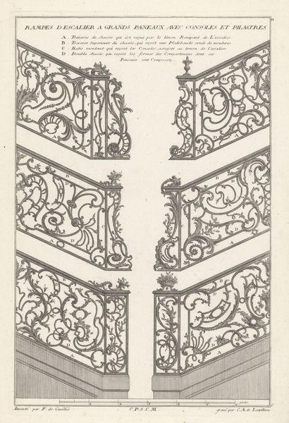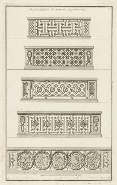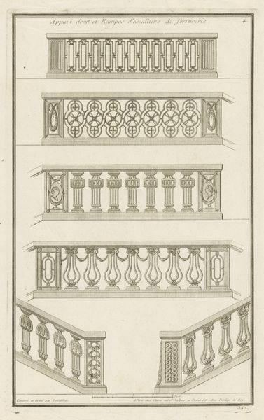 Curator: The piece before us, residing here at the Rijksmuseum, is called "Balustrades met geometrische vormen," created anonymously sometime between 1759 and 1784. Editor: My first impression is the delightful contrast. There's this rigorous geometric framework, rendered with precision, but within it, a play of flourishes that soften the overall effect. It has such interesting interplay of straight lines and curves. Curator: Indeed. These designs, executed as a print using metal engraving, speak to the era's preoccupation with both ornamentation and the rising influence of Enlightenment ideals of order and reason. Notice how these were meant to be prototypes for architectural elements. Editor: The line work itself is exquisite. It seems relentlessly two-dimensional, and creates patterns upon patterns. Even in reproduction, you sense the quality of the metal—cool, firm, permanent, almost as if the engravings are the platonic form for these architectural designs. Curator: Exactly. These balustrades exemplify Baroque aesthetics as they permeated public and private spaces. Consider the aspirations of the merchant class during this time; these were more than just functional elements—they projected status and refined taste within the changing urban landscape of cities such as Paris. Editor: Do you see, however, how the middle design adopts almost perfectly stacked vertically repeating ovals? I am sure it would not have fit into most places as an artistic oddity or expression, but certainly would fit in architecturally! Curator: Yes, there is a clear distinction and interplay of architectural styles represented here. It could even suggest new styles coming in. Editor: It's true the patterns and decorative flairs certainly are diverse in style and arrangement within the engravings. It gives you quite a lot to consider about that particular age, with such fine balance within all three balustrade concepts. Curator: It leaves one with a sense of that era’s delicate balance between innovation and established order. Editor: Definitely, I find myself appreciating the linear complexity—almost meditative.