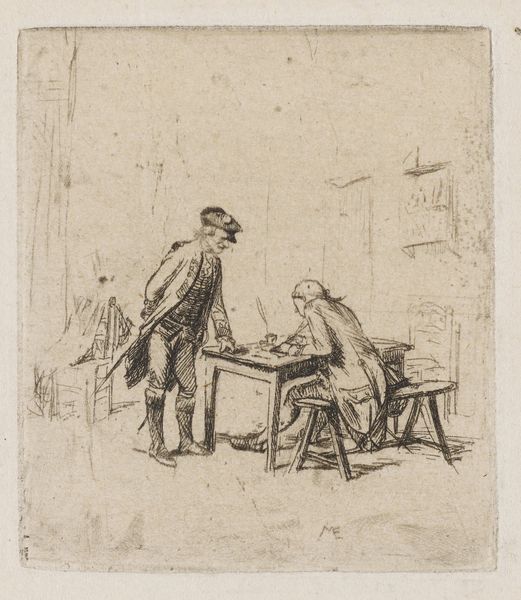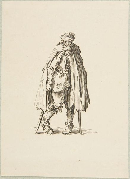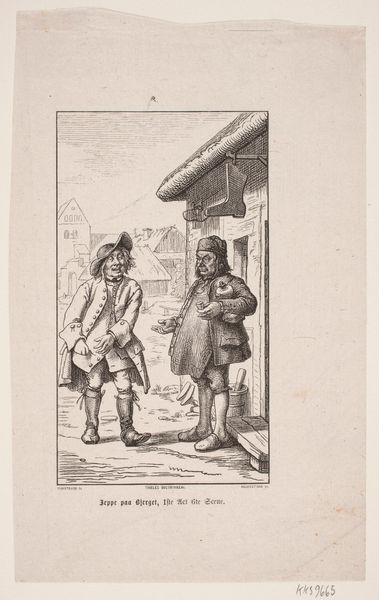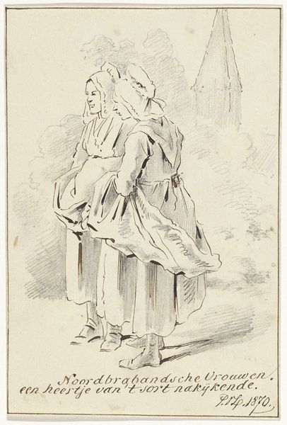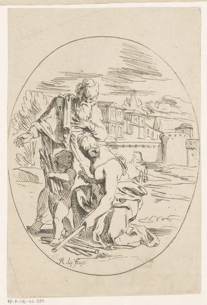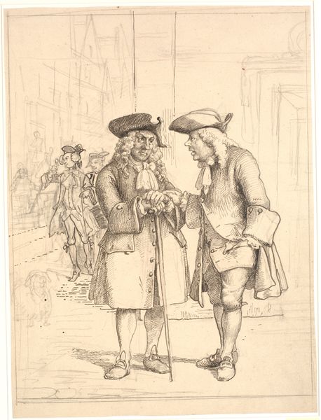 Curator: Jacobus Ludovicus Cornet’s "Zwervend gezin op straat," which translates to "Wandering Family on the Street," drawn between 1825 and 1882, uses pen and ink to depict exactly what the title suggests: a family on hard times. Editor: The mood is undeniably bleak. The bowed heads, the evident poverty…it all conveys a strong sense of hardship. Curator: The method mirrors the subject; Cornet uses thin, scratchy lines to create texture and shadow, enhancing the worn appearance of the family's clothes and surroundings. Consider the physical act of repeatedly dragging a pen across paper—it's repetitive labor mirroring the family’s relentless struggle. The sketch is on display here at the Rijksmuseum. Editor: Yes, there’s a clear narrative here. The woman's head covering evokes mourning, perhaps signifying loss and displacement, with the father clinging to his son, protecting what little they have. What do you make of the discarded hat in the corner, seemingly sheltering a cat? Curator: That detail adds layers. Is it symbolic of abandoned dreams, a lost home? The presence of the cat offers both pathos and perhaps a flicker of hope—even in destitution, life finds a way to persevere. This work serves as an interesting record of societal challenges during that time. What narratives can be uncovered regarding access to affordable tools to create such stark social critique and disseminate awareness of impoverished families in the Netherlands during this period? Editor: From a purely visual point of view, notice the composition, particularly the contrast between the crisp lines describing the architecture in the background and the more fluid strokes detailing the figures themselves. It seems to juxtapose the permanence of the city with the precarity of the family's existence. Curator: Exactly! That contrast also hints at the social structures that perpetuate this cycle of poverty, these are the underlying narratives, if you consider that he had access to such costly art production. I am left questioning the degree of social mobility he actually was witness to or believed. Editor: This examination underscores the human ability to empathize with universal themes such as family, displacement, and perseverance and to draw a lasting, if somber, reminder of social inequalities. Curator: Indeed. Examining it through the lens of material reality brings forward intriguing possibilities to consider art and agency, as a way of asking social and material questions, a practice still evolving.