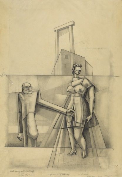 Curator: Wow, this drawing gives me the chills, it is almost haunting. The artist depicts what looks like a dissection of the self. Editor: It is, indeed, quite striking! What we have here is Arnold Rönnebeck’s “Self-Portrait” from 1933, created using pencil. Rönnebeck was deeply involved in modernist circles, especially those surrounding Diego Rivera and Frida Kahlo in the US. Curator: Okay, that gives a new layer of insight to what at first appeared as a simple drawing, the work’s intensity hints to social circles with modernist values that challenged the conservative norms and oppression of the early twentieth century. The naked woman with what looks like tailor measures marked directly in her skin reminds me of our constant battle with unrealistic beauty standards. What do you think? Editor: I absolutely agree. Rönnebeck situates himself within the gaze, quite literally—peering out from the lower center. This isn’t merely about aesthetic self-representation, it’s an assertion of artistic control and an examination of how the artist, particularly a male artist, perceives and constructs the female form and self. The presence of tools, such as the plumb bob, traditionally employed to test verticality, and mannequin casts only deepen that reflection. The way the drawing lays bare both interior and exterior forms, like an anatomy textbook, reflects the anxieties surrounding identity during the interwar period, I think. Curator: The drawing feels deliberately unfinished, chaotic… fragmented, much like our own self-perception, never quite whole or resolved. It's a brutally honest reflection, if I might add! And this honest representation serves as a social commentary, the lack of any warm color is replaced with a monochrome aesthetic to reveal both vulnerability and calculated artistic construction. Editor: Right. The modernist exploration, in Rönnebeck's rendering, transforms the nude from an object of beauty into an object of intellectual scrutiny and a site of ideological contestation. The “Self-Portrait” captures this moment, demanding viewers acknowledge the complex layers of self-awareness and social critique embedded within a single image. Curator: Thank you! You gave me the precise tools to enjoy and unravel this hauntingly beautiful artwork even more. Editor: My pleasure. This piece reminds us of art's power to mirror, question, and sometimes even disturb our understanding of the self.