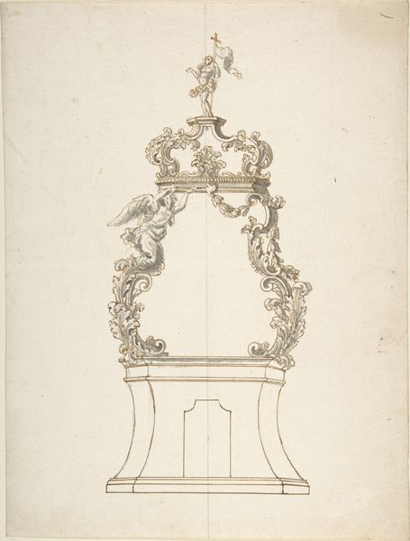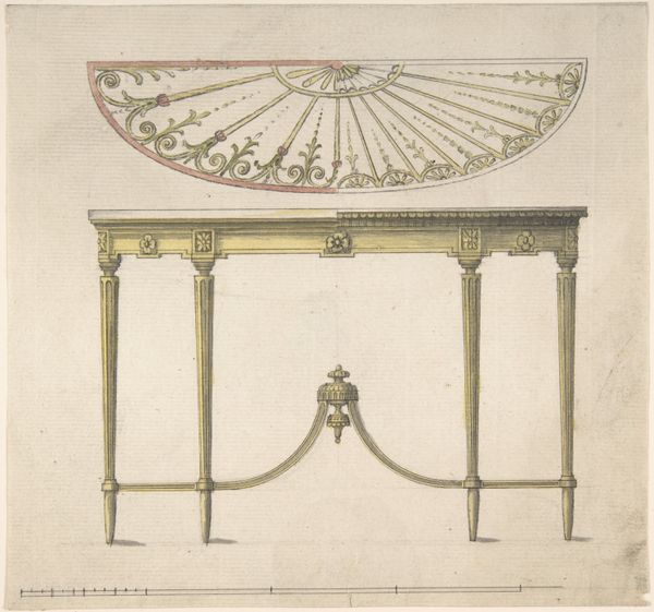 Editor: Here we have Robert Adam's "Design for a Console Table," created sometime between 1750 and 1800, using pencil, pen, watercolor, and print. The detail is exquisite, yet there's a utilitarian purpose at its core. How should we interpret this blending of art and function? Curator: Looking at this piece through a materialist lens, I see more than just a design. Consider the labor involved. The drawing itself is a form of production, reliant on access to specific tools—pencils, watercolor, paper. But it also speaks to a whole system of labor waiting to happen; crafting that table would necessitate woodworkers, carvers, gilders... all specialized trades contributing to the final product, within a clearly established social hierarchy. What does the materiality itself—the wood, the paint—tell us about the consumption habits of the elite during this period? Editor: So, beyond the aesthetic, we should consider the economic and social conditions required to produce such a piece? Curator: Precisely! And don’t forget about the context of Neoclassicism itself, which often looks back to idealized forms. The use of particular materials like mahogany, which could stand in for Roman and Grecian aesthetics was key, especially considering what those meant to elites. We must analyze the flow of materials, from their extraction to their final placement within a domestic setting. Editor: I see now that the beauty is just the surface. The drawing allows us a glimpse into production, class, and the flow of goods within that time period. It is not simply aesthetic, but rather tells a historical tale. Curator: Exactly! Next time you see something so beautiful, remember to examine the story of labor and resources that make it exist.