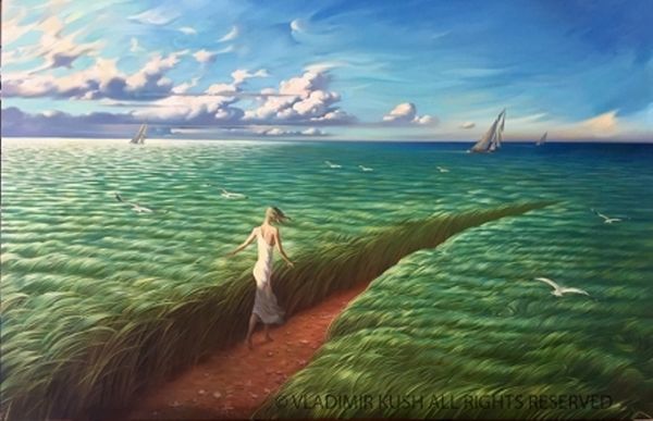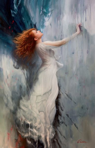 Curator: What a captivating piece! This is "Awakening," an oil painting created by Michael Cheval in 2021. Its immediately striking. It feels both calming and chaotic, a real visual paradox. Editor: Absolutely. My eyes are drawn to the materiality here: the texture he's achieved with oil paint to mimic the water's turbulence versus the almost fluid draping of the cloth…it's quite masterful. Curator: Cheval's surrealist style certainly lends itself to this juxtaposition. You see a nude woman, almost floating amidst a stormy sea, wrapped in golden fabric. In the reflection of the water, there's what looks like a sunken ship mirrored from above. It gives the scene such a mythic quality. Editor: Yes, and I find myself considering the social implications. The sunken ship beneath a calm, if naked, woman seems rife with colonial allegory: those beautiful draperies obtained perhaps at great cost. The relationship to water and commerce makes the piece very layered. Curator: I interpret it more as a reflection on internal versus external states. She looks so peaceful despite the turmoil surrounding her. Perhaps it reflects on the artist's position in society too, creating beauty amidst, if you will, societal wreckage. Cheval often deals with such binaries. How the image reflects on art markets too… food for thought! Editor: Fair point, I’m just deeply invested in how that fabric has been manufactured. You see the details, so clearly depicted and it calls for us to remember the hands and conditions that make up such luxury. Curator: I can see your point, but it’s equally about the grand art historical traditions he’s playing with, too. A surrealist revisiting Romanticism’s fascination with sublime nature. Its quite loaded within an art market that perhaps privileges individual authorship above all else. Editor: I’m glad you reminded us that. These dialogues—between materiality and the museum wall, between process and politics—allow the viewer a more rich insight of the artistic creation as an end point that started in many places. Curator: Indeed. It makes “Awakening” more than just an image but an unfolding conversation.