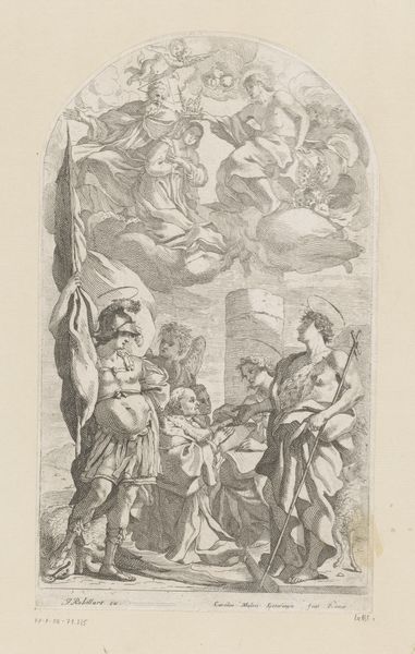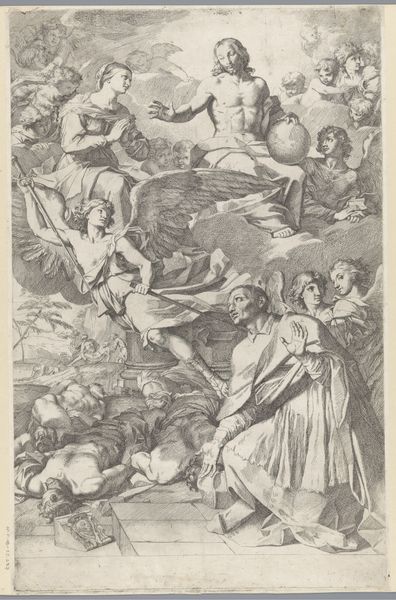 Curator: Immediately, I'm struck by the theatrical drama captured in this engraving. The light seems almost to emanate from the figure of Christ. Editor: Indeed. This is "The Resurrection of Christ, with soldiers awakening before the tomb," a piece attributed to Martino Rota, dating from between 1565 and 1583. The engraving presents a powerful visual narrative, skillfully rendered using the techniques of the Italian Renaissance. It currently resides at the Metropolitan Museum of Art. Curator: Note the intricate crosshatching that gives form and volume to the figures, creating a chiaroscuro effect, especially around the rising Christ and the stunned soldiers. The composition emphasizes the vertical ascent versus the horizontal sprawl of the figures guarding the tomb. It guides the eye inexorably upward. Editor: The socio-political elements inform its reading, certainly. Engravings like these played a crucial role in disseminating religious imagery, shaping popular understanding and belief in the era of the Reformation. Consider how this print may have circulated; who could access it, and how might its imagery be deployed to sway the religious and political debates of the time? Curator: Valid considerations. However, the artist's use of contrapposto in Christ's figure adds dynamism and visual interest. And the texture achieved by the different types of lines mimics the real world in a subtle yet remarkable manner. Editor: The artist’s success in this is not an isolated marvel, rather it needs to be framed within a history of images of the resurrection, each with its own propagandistic motives. Viewing the fallen soldiers not just as artistic devices but as symbolic casualties in a war for ideological dominance really elevates the picture to its intended value. Curator: Agreed. Even so, its lasting effect hinges upon the masterful use of line, the distribution of light, and a clear and focused narrative arc. Editor: Absolutely. By exploring both the formal qualities and historical context, we can come to a more comprehensive view of Martino Rota’s remarkable artwork. Curator: A symbiotic synthesis, I'd venture to say! Editor: I concur completely.