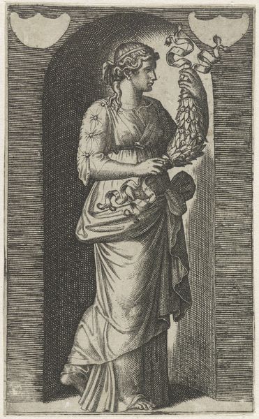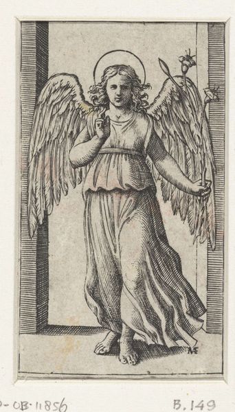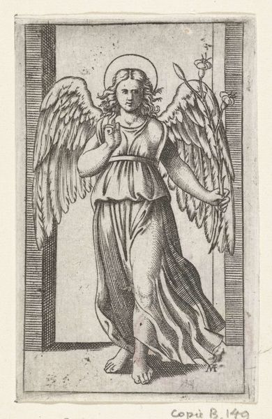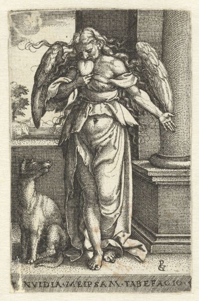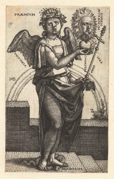 Curator: Here we have "Allegory of Christianity," an engraving. The artwork, skillfully rendered in the Northern Renaissance style, presents a complex layering of religious symbolism. Editor: It strikes me as incredibly unsettling. The harsh lines of the engraving amplify the weightiness of the figure, and there's this almost accusatory stare... it evokes a sense of judgment. Curator: The composition centres on a winged female figure representing Christianity, and consider how that representation normalizes white femininity as the embodiment of divinity. Editor: And look at the way Beham contrasts her fleshy form with the symbolic items: a luminous sun head with a distinct scowl, the scepter emblazoned with faith and hope, the exposed heart... The engraving’s emphasis on line underscores a tactile, crafted quality. Curator: The use of Latin words further highlights the intellectual milieu in which this piece was conceived. Consider also the implications of positioning “Diabolvs” or Devil right under her feet. What can you tell us about that from a material point of view? Editor: Right. I’d note the pressure of the printing process that has firmly pushed the female figure onto the material subjugated by its creation. Its positioning could be read to symbolize overcoming the material desires. The meticulous craftsmanship inherent in the engraving process stands as a testament to both artistic skill and the broader socio-economic structures that facilitated its creation. Curator: Right, but looking beyond the craft to the social impact, it speaks to gendered dynamics that extend well into current intersectional narratives and lived experience. Editor: True. The work undeniably serves as a potent artifact of its time, mirroring the intertwined realms of religion, craftsmanship, and socioeconomic dynamics. The very act of engraving mirrors the processes that made the Renaissance and allowed this engraving to even exist. Curator: Yes, exactly. Thinking of gendered religious expression that persist today as products of the complex intersection between social movements, religion and capitalism help open interesting pathways into cultural understanding. Editor: Absolutely, there are so many points that could continue our discussion! Thanks! Curator: Definitely. Thank you.