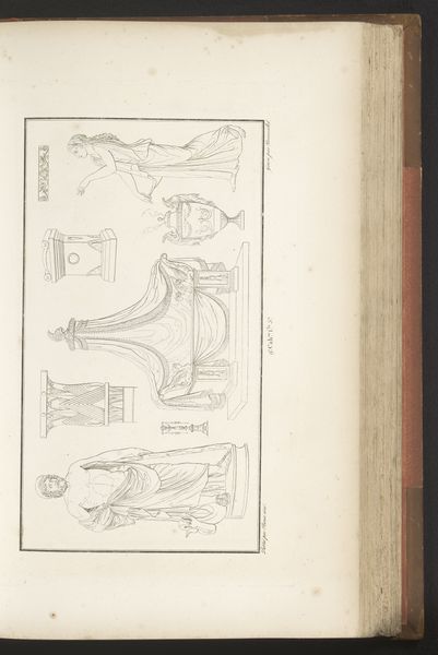 Charles Pierre Joseph Normand created these ‘Reliëfsculpturen’, a series of engravings, sometime before 1840. Each composition within this page presents a study in classical form, rendered with precise linearity. The cool tonality of the engravings accentuates the architectural and sculptural details. Normand captures the essence of classical relief, emphasizing contour and the interplay between positive and negative space. The figures, often set within implied architectural frames, suggest narratives of heroism, love, and artistic inspiration, mirroring the values of Neoclassical art. Normand’s work functions on a semiotic level, employing a system of classical symbols, poses, and settings. These elements are deeply encoded with cultural meanings, evoking notions of virtue, beauty, and the sublime. The engravings encourage us to see how classical forms transmit cultural values, reflecting both the aspirations and the ideological underpinnings of the period.