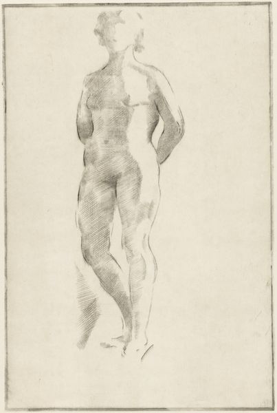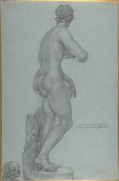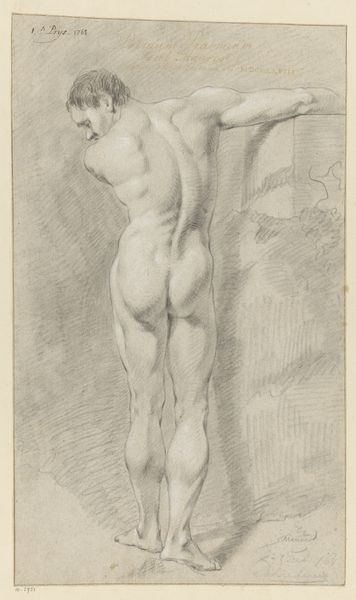 Curator: This pencil drawing, “Standing Male Model, Seen from the Back, with Right Hand Raised,” comes to us from Heinrich Dittmers. Dating from somewhere between 1625 and 1677, it resides now in the collection of the SMK, the Statens Museum for Kunst. Editor: My initial impression is one of intense study. The musculature is so meticulously rendered, and the use of light and shadow really makes him seem… present. Curator: Absolutely. The pose, with the raised arm, is so reminiscent of classical sculpture—the figures of heroes, gods—suggesting perhaps a yearning for the ideal human form. The staff he holds adds to this sense of ancient gravitas. Editor: That arm raised high, for me, suggests a kind of yearning, maybe reaching. The line of the back is gorgeous, the contrapposto subtly echoed in the positioning of his legs… He’s solid, but there's also something vulnerable in turning his back to the viewer. Curator: Note how the nudity ties into themes of vulnerability and honesty, especially in religious art. We also can consider a societal viewpoint with male forms representing cultural values, power, and ideals. I suspect viewers at the time of creation read various classical and philosophical cues based on how this figure was staged. Editor: Agreed, the historical associations with academic drawings must be factored in. Still, I appreciate how Dittmers doesn’t just slavishly reproduce an ideal. Look at the individuality of the muscles, the slight imperfections in the skin… it’s about observed reality too. Curator: So true; the blending of the symbolic and the observed gives the artwork a layered resonance that stretches across centuries. The cultural encoding creates dialogue through time. Editor: Ultimately, I think this piece demonstrates that the language of form can itself be powerfully expressive, conveying deep emotion and historical context. It feels like we've only scratched the surface, really.