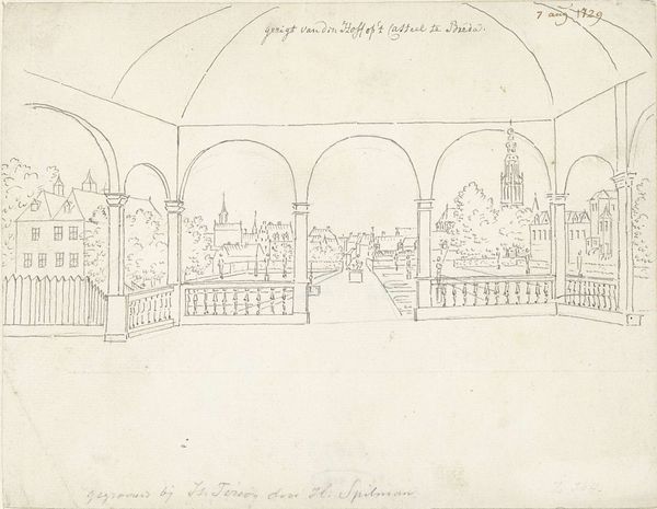 Curator: Look at this drawing titled, "View of a Courtyard Surrounded by Buildings in Gothic Style with Central Clock Tower." The piece, an etching done with pencil, is currently held at the Metropolitan Museum of Art, and dates somewhere between 1800 and 1900. What are your initial thoughts? Editor: Austere. The delicate etching work and muted tones contribute to a somewhat somber atmosphere. The courtyard seems rather deserted despite the presence of figures, leaving a distinct air of isolation. Curator: The composition, structured with meticulous detail, directs our gaze to the central clock tower. Note the repeating architectural elements – the arches, the chimneys – which create a rhythmic pattern. Semiotically, the tower is not just a functional component, but signifies time and control. Editor: Yes, but who is doing the controlling? It seems to me that the act of etching here becomes essential. The line work feels fragile and tentative. Pencil as the grounding base, if you will, for this fragile landscape of industry. There's a sense of laborious reproduction, perhaps even highlighting the social divisions inherent in a society governed by these rigid structures of time and space. Curator: An astute observation. Consider the artist's choice of Gothic style, reviving historical architectural forms and, therefore, past societal structures within this rendition. Editor: It's interesting to think about this being a proposed design. I'd even suggest the piece is not simply a detached depiction of Gothic ideals. It engages with the materials of labor. Who commissioned the artwork? Where would the raw materials have come from, and at what cost? I wonder what insights a socio-historical reading may grant here. Curator: The piece, in its own way, becomes an invitation to contemplate broader historical narratives interwoven in our relationship with spaces, art, and temporality. Editor: Agreed. This seemingly straightforward architectural rendering becomes remarkably intricate once we consider the implications behind production. It certainly prompts us to investigate and challenge pre-conceived notions.