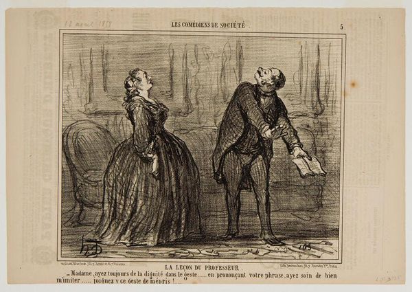 Editor: So, this is Honoré Daumier’s lithograph, Robert Macaire, Marriage Agent. It feels like a satirical commentary on societal expectations. What’s your interpretation? Curator: The grotesque figures reveal the economic transaction inherent in marriage. Daumier critiques the bourgeois obsession with wealth through caricatures, exposing how social mobility becomes a performance. The women, especially, are rendered as commodities. How does this make you feel? Editor: It's unsettling, how power dictates relationships. It makes me think about the limited choices women had. Curator: Exactly! Daumier provokes us to question these inequalities. His work reflects the revolutionary context of France, challenging established norms and class structures. Editor: It’s eye-opening to see how relevant these social critiques remain today. Curator: Indeed. Daumier reminds us to analyze power dynamics within our own social institutions.
