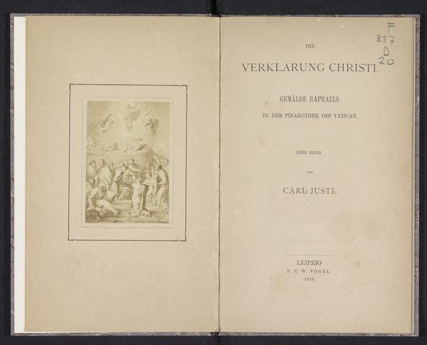 Editor: This is "Galerie C. Verlat", a print from 1880 by Mees & Co. It looks like an advertisement of sorts… maybe even a book cover? I'm immediately drawn to the aged paper and the elegant typography, giving it a very vintage feel. What catches your eye in this piece? Curator: Oh, I love that you see the ‘vintage feel’ immediately. For me, it’s the subtle narrative playing out. We have this ethereal figure in the inset image - is it an illustration or an engraving perhaps? - and then we have the very direct declaration of "Galerie C. Verlat". The contrast begs the question: What is this gallery offering? Is it beauty? History? A touch of the divine? What do *you* think? Editor: Hmm, that’s a great question. I hadn't considered it from that perspective! The "touch of the divine" aspect really makes me see the work differently. Curator: Right? It makes you wonder what secrets and artistic perspectives could be hiding behind those gallery doors. The engraver Mees & Co. is almost setting the stage, selling the ‘feeling’ as much as the gallery itself. Do you see that decorative monogram between the gallery's name and the address, the stylized ‘M’? It tells us this is a brand. Editor: Now that you point it out, it does seem intentional! Almost like they were curating their own image with as much care as the gallery itself. I’ll be sure to notice details like this in the future. Thank you! Curator: Absolutely! It’s often the little details that whisper the loudest secrets. Art invites us all in to reflect on things hidden, so keep looking and finding out about them.