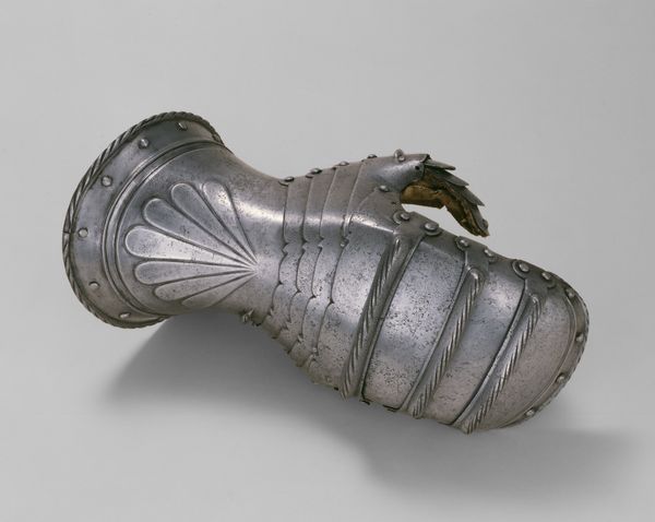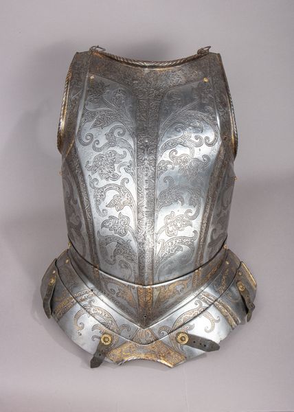 These elements of armor garniture were made by Wolfgang Grosschedel in the mid-16th century. They're primarily constructed from steel, a material renowned for its strength and malleability. The surfaces were meticulously shaped, likely through hammering and forging techniques, requiring immense skill and physical labor. Look closely, and you'll see the etched decorations of intricate floral motifs and geometric patterns. These were achieved by applying acid to bite into the metal, a complex process demanding precision and artistry. These motifs elevated the functional armor to a symbol of status. The production of such armor involved a collaborative effort, with various artisans contributing their expertise, reflecting a complex division of labor. In its time, this was as much a feat of engineering as it was of artistry. The armor represents the wealth and power of its owner and the skill of the artisans who created it. Considering the material and the making, we understand that this armor transcends mere protection; it embodies a convergence of craft, design, and social significance, blurring the lines between fine art and functional object.