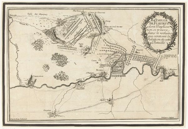 This is Jacobus Harrewijn's engraving titled "Kaart van de slag bij Oudenaarde," created in 1708. This map depicts the Battle of Oudenaarde, a key moment in the War of the Spanish Succession, a conflict largely fought over dynastic power in Europe. Harrewijn, working in the Dutch Republic, was part of a culture deeply engaged with cartography and representation. The map flattens the landscape into a strategic overview, reducing human lives to mere troop movements. What does it mean to witness a battle rendered as a set of lines, distances, and positions? While the map emphasizes military strategy, it's also a product of its time, reflecting the Dutch Republic's preoccupation with trade and military power. Consider the emotional distance of the map-maker, abstracting violence into a carefully rendered document. Maps like these helped shape both the conduct of war and the narratives that followed, obscuring the ground-level realities of conflict.
