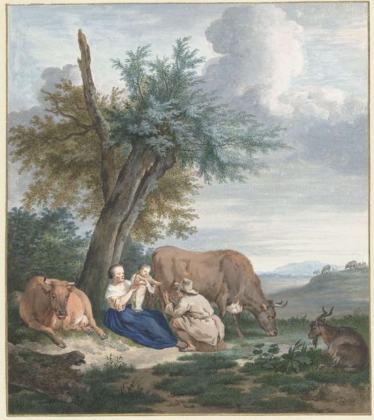Curator: Looking at "Cattle in an Orchard," created circa 1790-1815, in watercolor by Pieter Gerardus van Os. Such pastoral serenity! My first impression is how delicately the artist captures the drowsy atmosphere of a warm day. Editor: Drowsy is certainly one way to put it. I find the subject matter somewhat...unremarkable. Can we contextualize this in any interesting way, perhaps discuss the period it reflects, how emerging agricultural practices defined representations of the pastoral? Curator: But that's where the brilliance lies, surely. Van Os eschews the grand, idealized landscape. Instead, we are presented with a closely observed tableau of form, line and shadow—the strategic use of a coloured pencil emphasizes textures, a sophisticated application of the plein-air style. Note the calculated juxtaposition of shapes formed by the clustered animals, creating a contained compositional harmony. Editor: Indeed. We could also discuss how these genre paintings were a means to depict societal changes. Artists, in portraying idealized countryside life, conveniently ignored the rising class disparities exacerbated by transformations in the agricultural sector. The composition conveniently excludes indicators of a challenging rural lifestyle, a farmer is seen off to the distance and the inclusion is hardly noticeable.. Curator: I see what you’re suggesting, but doesn't that interpretation run the risk of imposing a contemporary viewpoint onto a work that may be driven primarily by artistic concerns? Perhaps it is in its very simplicity that Van Os seeks to express harmony—the convergence of natural and cultivated spaces within clearly defined contours, enhanced by balanced luminosity. The light falling just so. Editor: But harmony for whom? Doesn’t the formal construction betray an underlying message—a sanctioned image of order that ignores socio-economic realities? Furthermore, this image circulated amongst an elite able to distance themselves from rural concerns through bucolic idealism, so that we may understand art as both cause and reflection of certain social biases. Curator: Perhaps you're correct. We could say that while the watercolor exhibits undeniable sophistication in technique and arrangement, its calm aesthetic belies deeper cultural nuances concerning man's relationship to landscape and power during a turbulent period in Europe. Editor: Precisely. It’s this layered reading that makes understanding works like "Cattle in an Orchard" continuously rewarding.