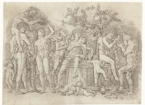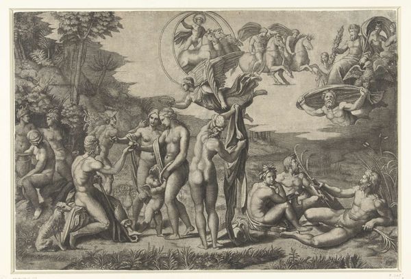 Editor: This is "Dream of Paris" by Georg Pencz, created sometime between 1540 and 1542. It's an engraving, so a print, and it looks incredibly detailed. It has this surreal, almost unsettling atmosphere... Like a classical fever dream. What are your initial thoughts about the image? Curator: Well, it's interesting to consider the socio-political context in which Pencz was working. Printmaking at this time, particularly engravings, facilitated wider dissemination of images and ideas. What narratives were being circulated, and who controlled that circulation? The classical subject matter, specifically the Judgement of Paris, was often used to legitimize power through mythological allusions. Who benefits from representing Paris in this particular way? Editor: You mean, how it uses the old story to say something new? Curator: Exactly. This engraving reflects anxieties about decision-making, temptation, and the disruption of social order. Note the Cupid figure. What impact did interpretations of the classical Cupid have in Renaissance art? How did artists use or challenge accepted portrayals, to comment on power, desire, and morality? Editor: I hadn’t considered that. I was just focusing on the, well, the overt sexuality and wondering if that had something to do with why it’s in the Rijksmuseum collection! Curator: The nudity absolutely plays a role! It signifies vulnerability, but also status depending on the historical era. How does the artist use it to represent and influence the political power structures in place at the time? This era also struggled with the rise of the printing press; what would society and patrons make of seeing allegorical figures from classical myth on affordable prints? Editor: Wow, okay. There's a lot more going on here than just some nude ladies and a sleeping guy! Thinking about the historical context really opens up new ways to see it. Curator: Indeed. Considering the socio-political background reshapes our understanding of not just what is depicted but *why* it's depicted in this manner, which also suggests more about how it was perceived when first created.