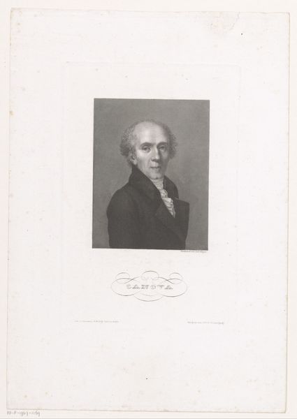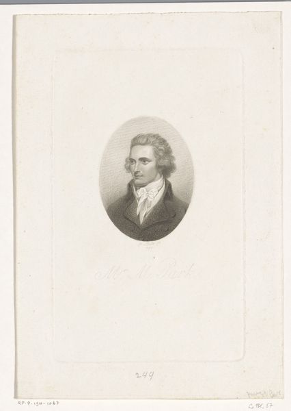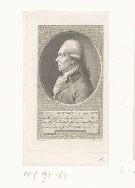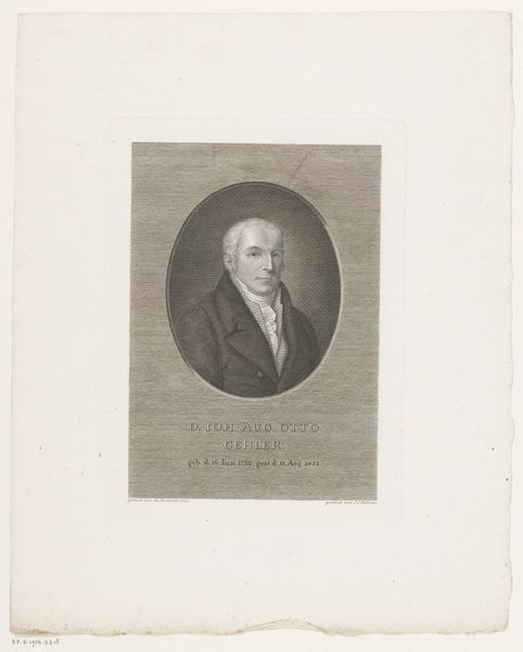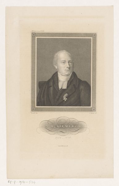 Curator: This is a print from between 1805 and 1817, a portrait of Rutger Jan Schimmelpenninck by Ludwig Gottlieb Portman, currently held here at the Rijksmuseum. It is an engraving, showcasing a figure within an oval frame. Editor: My initial impression is one of stern authority, though the gray palette also conveys a sense of cold remove. The formality is almost intimidating. Curator: The composition adheres quite rigidly to Neoclassical principles, doesn't it? The portrait is centered, contained within geometric forms. Note the restrained elegance of line and form, mirroring the rational ideals that underpinned the Neoclassical movement. The engraving medium itself lends to that sense of precision and clarity. Editor: It is tempting to consider Schimmelpenninck's position within the Bataavian Republic. Was this portrait meant to project power and stability during a period of political upheaval? The inscription below seems to bolster this idea of authority and leadership in the face of uncertainty. How might his role as Raadpensionaris—the leading politician—influence the visual narrative? Curator: Precisely. Portman’s mastery in capturing the texture of the coat and the man's subtle facial expression is really the main visual event in this carefully constructed design. There’s a deliberate flattening of space which puts the figure forward, emphasizing presence without resorting to bombast. Editor: Yet that very controlled style raises questions. Was this visual restraint a way to distance Schimmelpenninck from the excesses of the past—the monarchy, perhaps? Or did it perpetuate a new form of elite power? There’s a fascinating tension here between the surface representation and the socio-political complexities it attempts to contain. Curator: Looking at the engraving’s lines, the gradation of tone, the overall organization on the page, I am left with an appreciation for the restrained elegance of Portman’s technical skills and ability to realize Neoclassical aesthetic values. Editor: I leave with the sense that this piece is a cultural artifact and a visual document that compels us to critically examine not just the portrayed subject, but also the power dynamics embedded within that era.