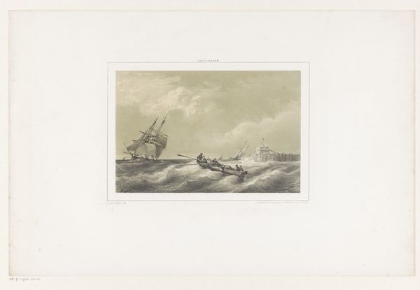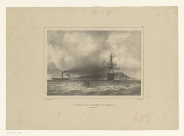Ferdinand Victor Perrot made this lithograph, "Vissersboot en zeilschip voor anker," at an unknown date. The lithographic process, essential to understanding this work, involves drawing on a flat stone surface with a greasy crayon, then treating it with chemicals so that ink adheres only to the drawn areas. The resulting print captures a wealth of detail, from the billowing sails to the choppy waves. Note the stark contrast between the dark, heavily inked lines of the ships and the lighter, more subtle tones used to depict the sky and water. This contrast emphasizes the texture and weight of the vessels against the ephemeral backdrop of the sea. Lithography democratized image production, allowing for affordable reproductions on a mass scale. This piece speaks to the wider social issues of labor and industry, depicting scenes of maritime labor that were increasingly accessible to a broader public through printmaking. By focusing on its materials, making, and historical context, we can better appreciate the significance of this lithograph.