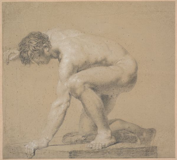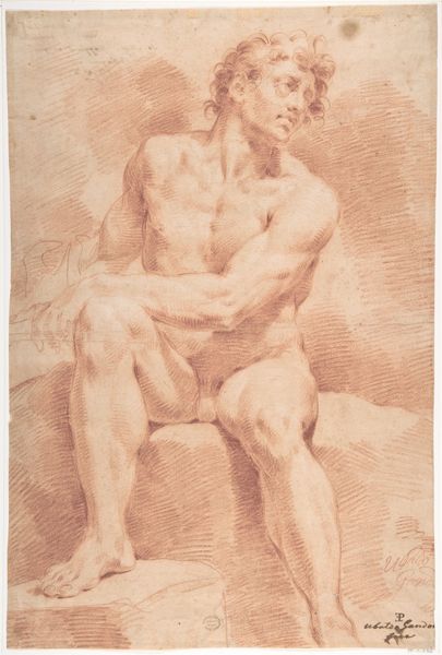 Editor: This drawing, simply titled "Nude Study," was created around 1768, artist unknown, and is currently at the Met. It's striking how the figure, rendered in red chalk, is both powerful and vulnerable. What strikes you when you look at this drawing? Curator: I am immediately drawn to the materiality of the red chalk itself. Consider the socio-economic context. Who had access to quality drawing materials at that time? Red chalk was preferred for life studies, so how does the accessibility to materials influence academic training and the construction of idealized bodies? Editor: That's a really interesting point about the materials shaping artistic production. I was just thinking about the pose; it seems very intentional. Curator: Absolutely. Think about the labor involved in both creating the chalk and the process of academic study. What kind of apprenticeship or instruction might the artist have had? Were there rigid guidelines they had to follow? How do those guidelines impact the representation of the nude figure and power dynamics inherent in the act of observing and recording a nude subject? Editor: So, beyond just seeing a figure study, you are interested in who made it, why they made it with this material, and what constraints were there. Curator: Precisely. The choice of medium, the academic setting, even the pose of the model all speak to the broader social and economic forces at play. By understanding the material conditions, we can challenge any notions of universal beauty that classical art is assumed to possess. Editor: This completely changes how I see the artwork, focusing less on the aesthetic qualities and more on its historical context. Thank you. Curator: My pleasure. Remembering the conditions of production often illuminates unexpected aspects of even familiar works.