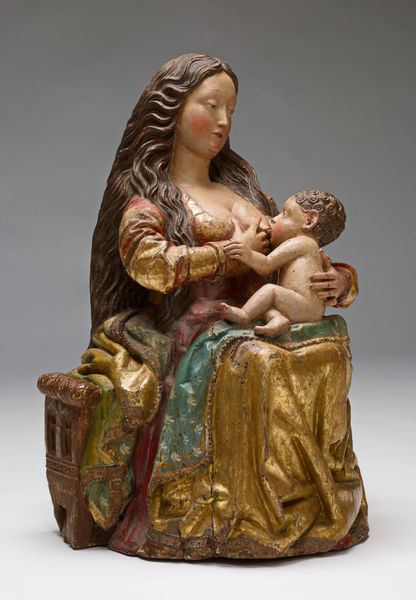 Curator: Madonna and Child, dating to somewhere between 1445 and 1599, invites contemplation on the iconic mother and child relationship. Editor: Immediately, the downward gaze and tender embrace evoke feelings of deep empathy. What is this marble work communicating through its austere surface and controlled geometry? Curator: The image of the Madonna, of course, is one deeply embedded within Western cultural memory. Here, the sculptor has imbued Mary with both maternal softness and an aura of serene dignity. The child's posture, clinging close, is also suggestive. Editor: Absolutely. I am compelled by the artist's treatment of drapery, a common element. Note how its linear rhythms cascade, shaping the forms, guiding the viewer's eyes across its surface, and giving tangible form to emotions. Curator: The intimate pose of the mother and child is very important to consider. As the archetype of motherhood, the sculpture’s details reinforce emotional vulnerability, piety, and love—qualities viewers over centuries could access and take with them into the world. The artist speaks not only to viewers in his era, but generations afterwards. Editor: While this might evoke feelings associated with familial bonds, from a design perspective the overall block-like construction achieves remarkable stability. I find this choice fascinating: the sharp planar adjustments across their faces capture shifts of light with superb control. Curator: I think its symbolic weight is something we also need to keep in mind as a continuous touchstone across art history. Images of mothers and children, from antiquity onwards, offer both personal resonance and broad narratives of the human condition. It gives meaning to our lives, a touchstone and hope, even when times are difficult. Editor: That symmetry is definitely what stood out most in the overall design: everything locked neatly into place. It really underscores the way Renaissance artists viewed human ideals. This piece encapsulates technical brilliance and its significance lies at an intersection of both concept and structure.