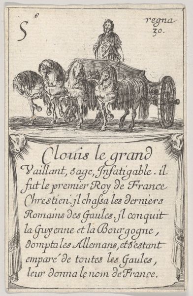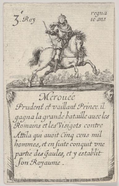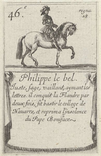 Stefano della Bella created this print of Pepin the Short as part of a series titled 'Game of the Kings of France,' an etching likely made to circulate amongst the French Aristocracy. Its existence speaks to the 17th century's fascination with monarchy and lineage. Pepin the Short, who ruled in the 8th century, is depicted here as a powerful figure, mounted on horseback and clad in armor. Inscriptions below highlight his virtues, military victories, and the lands he bestowed upon the papacy. The text presents a narrative of strength and generosity, key attributes of a leader. Consider the power dynamics at play. Della Bella, an Italian artist, is creating imagery for the French court, reinforcing French identity through its historical rulers. The print, while small, served to disseminate ideas of French power, and project an aura of divine right and nobility across Europe.