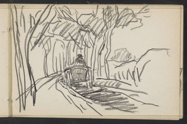 Curator: Alexander Shilling's "Dorpsstraat," created in 1923, offers us a glimpse into a simple street scene rendered in ink and pencil. Editor: My first impression is of quietude. Despite the cityscape, there's an almost rural stillness to it. The sketch-like quality, those unfinished lines, enhance that feeling. Curator: Precisely! The sketchy nature, the lack of elaborate detail, actually heightens the scene's emotional resonance. Consider how the rapidly sketched figure seems almost bowed under an unseen weight—suggesting resilience amidst daily life. The starkness of the image, devoid of color, speaks of an introspective world. Editor: Introspection born from the labor, I'd argue. This looks like a working-class area. See how functional the architecture is, plain gabled houses. It looks almost hastily captured. Was it on site? And I'd love to know about the particular inks and pencils he was using – were they readily available or artisanal? That might help define Shilling’s intended audience and production circumstances. Curator: We know Shilling was associated with groups interested in portraying modern life and national identity. This work might reference traditional folk tales, placing value on local or regional subject matter by using images easily deciphered and accessible to all. The houses are somewhat generic, archetypal—inviting viewers to reflect on shared history. Editor: Perhaps, but there's also a certain uniformity in the lines suggesting mechanization. I find the repetition almost soul-numbing. Did the means of production allow people the chance to express individuality, or was the artistic production line, so to speak, part of the broader issues faced by this working village? It brings the question of whether art could escape the constraints of labour or instead become part of that same process. Curator: The open lines and rather minimalist composition suggest an honest attempt to simply document a fragment of reality. Perhaps it represents an earnest engagement with a familiar world. Editor: Fair enough. Ultimately, that simplicity opens the image up for our scrutiny, which invites us to ask some more material-based questions regarding Shilling's aims and values in 1923.