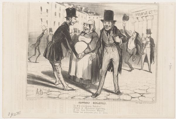 Editor: This lithograph, "Paris grippé," by Honoré Daumier, probably from the 19th century, depicts a street scene filled with bundled-up figures. Everyone looks so miserable! What strikes you most about this work? Curator: For me, this image is a powerful commentary on social stratification and public health in 19th-century Paris. Daumier uses caricature to critique the indifference of the bourgeoisie to the suffering of the working class during an epidemic. Notice the contrast in attire: some are well-covered, while others are nearly barefoot, highlighting the unequal distribution of resources. Editor: So you’re saying it's not just about a cold going around? Curator: Not at all. "Grippé" – meaning "in the grip of the flu," becomes a metaphor for the city being gripped by social inequality. Think about who is most vulnerable during health crises, even today. Who has access to care, to protection? Daumier’s realism serves as social critique. What about the expressions on their faces? Editor: They look uniformly distressed and, honestly, rather dehumanized. Like cogs in a machine grinding to a halt. I guess I hadn't really considered the class implications so directly, but now I see how Daumier uses illness as a lens. Curator: Exactly! He uses illness as a magnifying glass. He encourages us to confront uncomfortable truths about power, privilege, and who bears the brunt of societal failings. By looking at this image, we see how even something like an epidemic disproportionately impacts certain groups. Editor: That definitely gives me a new appreciation for Daumier's intent. It’s not just a funny cartoon; it’s a poignant social statement. Curator: Indeed. And by understanding the social context, the humor becomes even more biting, right? It becomes a powerful tool for social change.