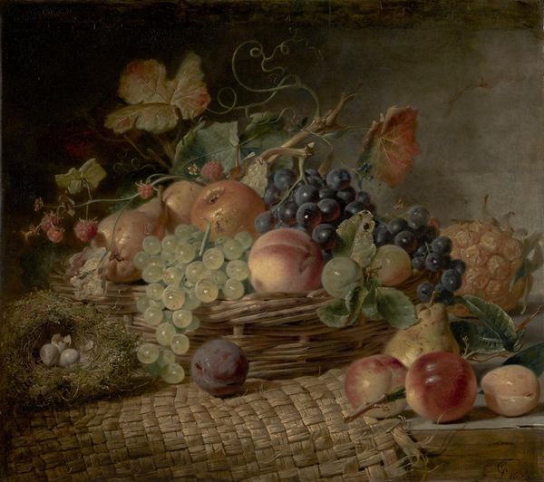 Severin Roesen's "Still Life with Fruit," presents a lavish display of nature's bounty. The pineapple, a symbol of hospitality and wealth, sits prominently. Consider the humble lemon, sliced open, revealing its juicy interior. This evokes associations with vanitas traditions, which remind us of life's transience. We see this in Dutch Golden Age paintings, where the half-peeled lemon symbolizes life's bittersweet qualities. Its sourness, a sharp contrast to the sweetness of other fruits, acts as a memento mori, reminding us of the ephemeral nature of earthly pleasures. The bird, perched precariously, adds a sense of dynamism to the scene. Birds often symbolize the soul or spiritual freedom, appearing in various mythologies. The vibrant colors of the fruit, juxtaposed with the dark background, create a tension that stirs deep-seated emotions of desire, longing, and the inevitable passage of time.