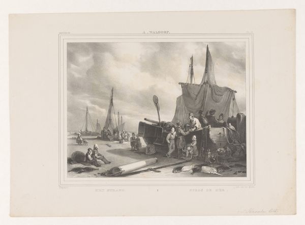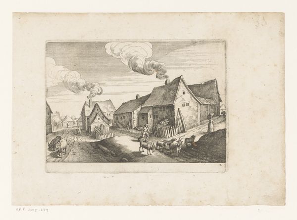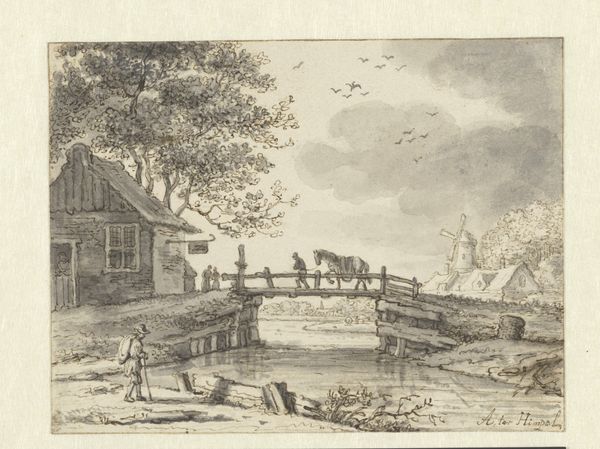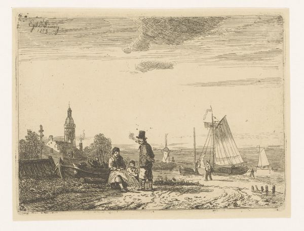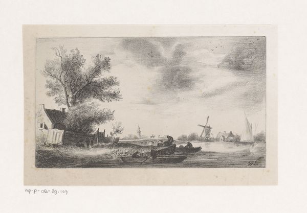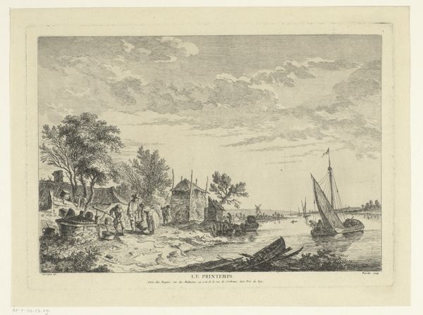 Curator: Quentin Pierre Chedel's "Landschap met twee huizen en bedrijvigheid aan een kade," created sometime between 1715 and 1763, offers a fascinating glimpse into 18th-century Dutch life. The artwork, housed at the Rijksmuseum, is an engraving that details a bustling waterside scene. Editor: Immediately striking is the light and shade contrast – quite dynamic for an engraving. There’s a softness too, an atmospheric quality despite the precision of the lines. Curator: This etching offers us a tangible connection to the everyday realities of the period. Look at the labor taking place by the docks – the loading and unloading of goods, likely crucial for the local economy. Notice how the architectural style of the two houses reflects practical considerations of materials and craftsmanship, speaking volumes about available resources. Editor: Structurally, I'm intrigued by how the composition directs the viewer's gaze from the darkened foreground, featuring a man on horseback, back toward the detailed activity at the wharf, finally resolving in the expansive, lighter tones of the water and sky. The repetition of vertical lines in the rigging of the ships creates a visual rhythm that's quite engaging. Curator: And consider the consumption patterns embedded in the imagery. This type of genre scene provided an aestheticized view of labour for wealthy patrons who very likely acquired such images, solidifying class boundaries via depiction. It’s more than just a pretty picture; it is a document revealing much about the organization of labor in Dutch society during that period. Editor: Certainly, one could see that. The figures working have become picturesque, integrated within this balanced and beautiful schema of line and form. Yet, do the signs of labor overshadow an appeal to visual harmony and balance characteristic of its time? Or does it successfully blend social commentary within an accessible and beautiful whole? Curator: Perhaps, therein lies its complexity – art and labor, intertwined in production and interpretation. Editor: Indeed. I’ve enjoyed how its formal qualities opened up discussion about its cultural implications, grounding abstract concepts of line and light with evidence of work and manufacture.