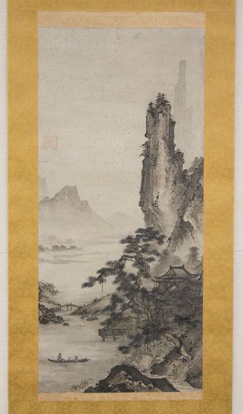 Curator: What strikes you most immediately about this traditional landscape? Editor: The composition is incredible. The soaring mountains, the way the mist softens the peaks...it has a real sense of the sublime. Curator: Indeed. The artwork, known as "Landscape," is an ink and watercolor painting attributed to Kakuho, likely created during the Meiji period, sometime between 1875 and 1918. What is intriguing is the consumption of painting and mounting scrolls as cultural products within the artistic conventions and commercial markets of Meiji Japan. Editor: Speaking of form, observe how the artist employs washes of ink to delineate depth. The brushwork, especially in the rendering of the trees, creates textures that feel both grounded and ephemeral. It seems meticulously planned, using artistic license in a representational piece to explore his materials. Curator: It certainly directs us to examine painting not only as representation but as object – an object created by manual skill in very specific contexts and conditions of production. It raises questions about how traditional forms adapt and are commodified amidst societal shifts towards modernization. Editor: The mountains resonate beyond geographical features. I see symbolic pillars reaching for transcendence, while the soft gradations of color, balanced so precisely, generate an air of profound peace. Curator: Absolutely, the delicate interaction of the medium, the labor involved, the reception it might have received in its contemporary marketplace – they offer very pertinent commentaries on the dynamics within Japanese culture at this period. Editor: A beautiful work. Exploring the intersection between meticulous aesthetic sensibility and artistic object provides us new angles. Curator: Precisely, looking at art through the lens of how the artistic hand intersects material history broadens our appreciation of art-making itself.