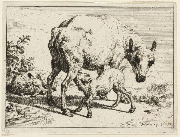 Editor: This etching is called "Camels" by Herman van Swanevelt, and it's pretty amazing how much detail he got using just lines. It almost feels like two separate scenes—the close-up camel looks very different than the ones in the distance with the figures. What draws your eye when you look at it? Curator: The camel in the foreground immediately commands attention, doesn't it? Think about what the camel symbolizes - resilience, endurance, travel across harsh landscapes. Then note its depiction amidst implied pyramids in the background. It speaks to an enduring symbolic connection, almost like a cultural memory being carried forth across generations, etched—literally—into the image. What do you make of that stark contrast between foreground and background? Editor: Maybe the pyramids represent permanence and ancient civilizations, while the camels embody continuous journeys and change. I never would've made that connection if you hadn't mentioned it. Curator: Indeed! And consider how the artist chooses to depict them. The foreground camel is so textured and immediate, whilst the distant shapes seem dreamlike, hinting at both presence and transience. Could the people there, with their camels, reflect a continuity, a living link, traversing history, perhaps even echoing biblical imagery? Editor: It’s like layers of time compressed into one image. Seeing them as symbols opens a whole new perspective. I guess I always just thought it was a picture of camels. Curator: Exactly. And how Swanevelt uses line and perspective works with the image—making it speak across centuries. Each element – animal, landscape, historical allusion – blends in a cultural script. Editor: I love how one image can hold so many narratives, it’s incredible!